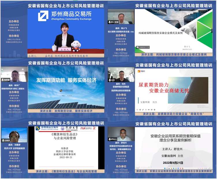 在专题授课中,郑商所研究所研究二部部长韩学广,同济大学法学院副教授刘春彦,信义玻璃投资者关系总监陈小飞,安徽辉隆农资集团氮肥事业部总经理助理刘杰,安徽省农学会油脂油料分会秘书长、安徽油脂网主任舒佳兴五位嘉宾,围绕大宗商品风险管理、套期保值理念、期货市场服务实体经济的模式及实际案例等进行了详细分享,帮助相关企业提高对期货市场的认识,用好期货工具,有效规避原材料和产品价格波动风险,从而提升企业风险管理能力,实现高质量健康发展。
